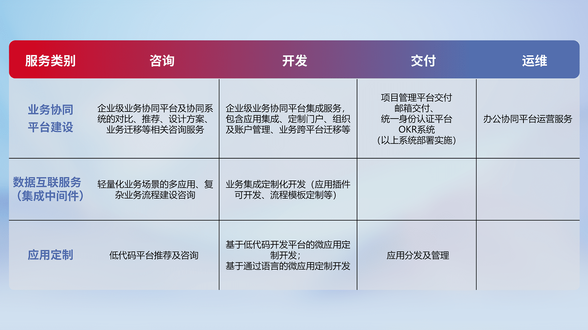 针对钉钉、、、企微、、、、IDaas等平台级产品提供产品的规划、、方案、、交付、、、定制化开发等服务,,,,实现如统一协同办公、、智能客户服务、、、、混合会议管理、、智能数据查询、、、、等业务场景,,实现数字化转型。。。